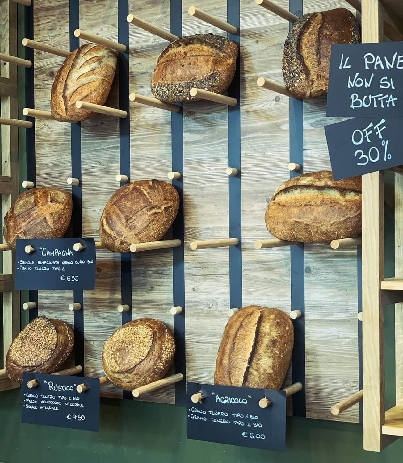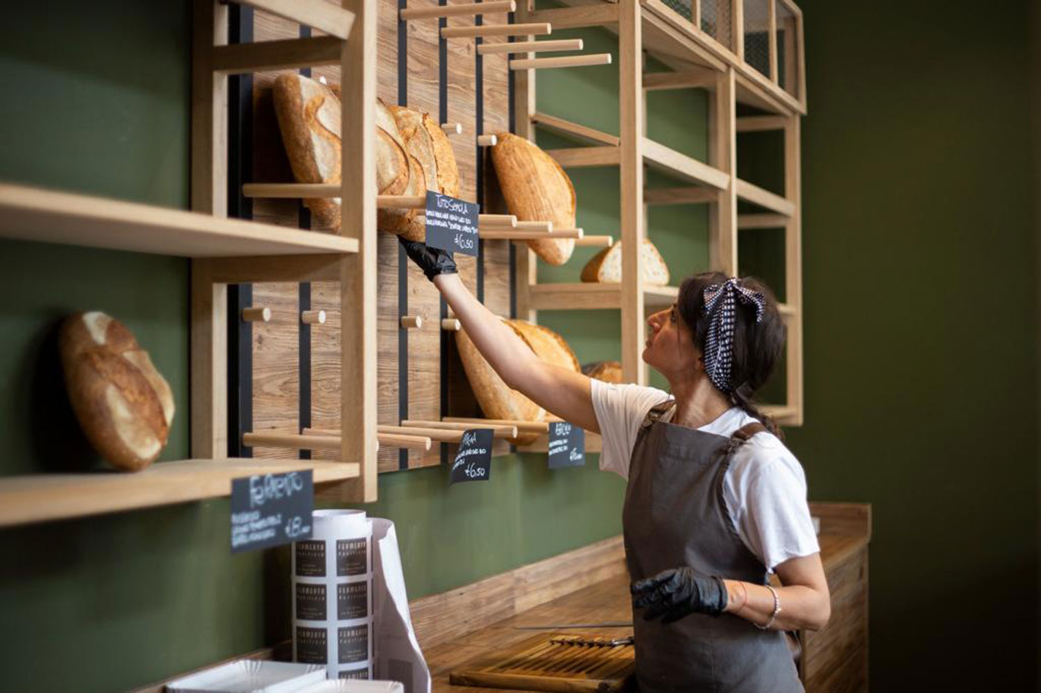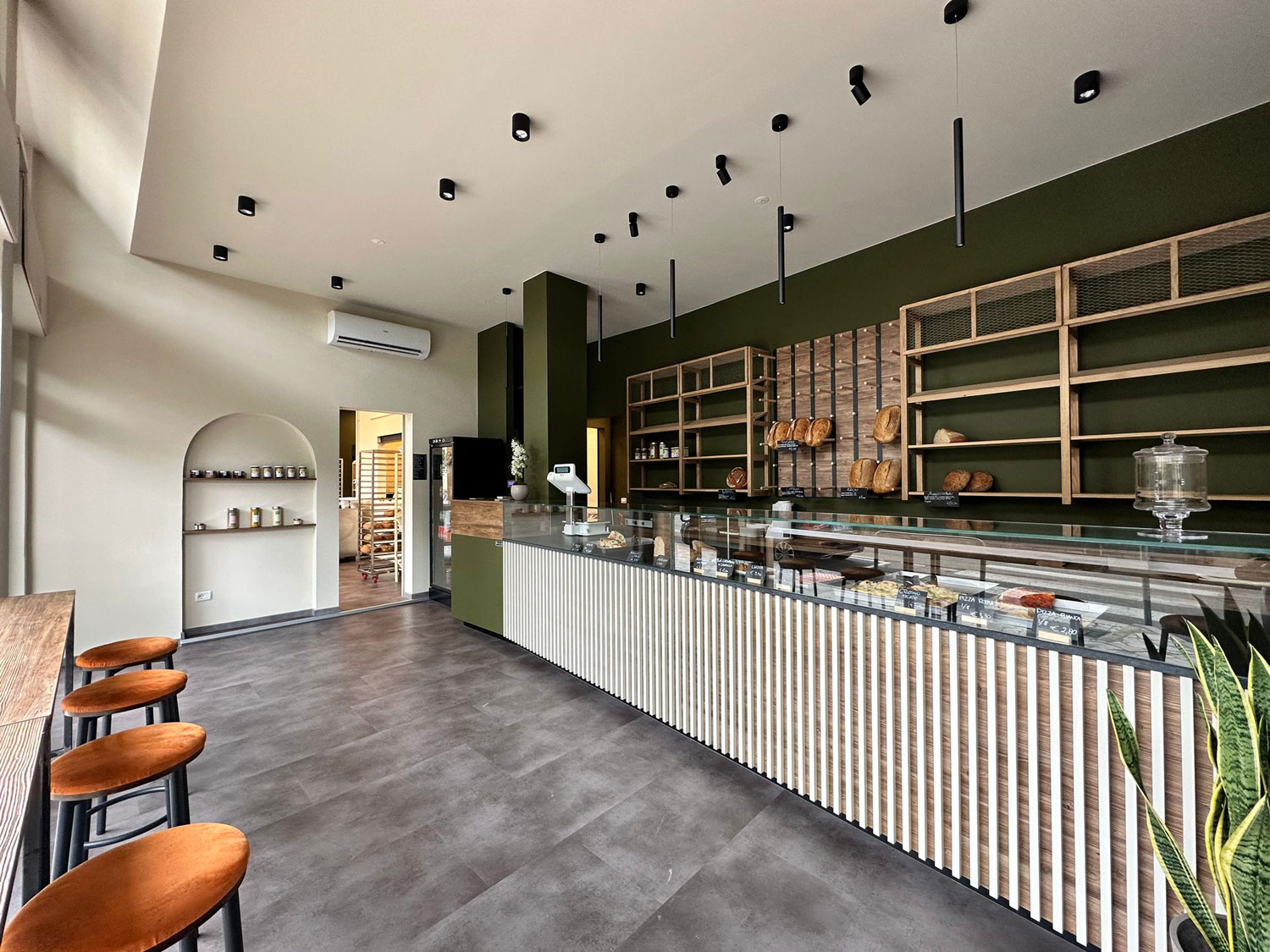 Punto vendita con laboratorio a vista, dove l’utilizzo di materiali e colori naturali sottolinea la genuinità del prodotto, il quale diviene il protagonista in un ambiente accogliente ed orientato alla funzionalità.